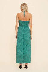 Our Stella Gathered Tie Neck Detail Midi Dress in Green Paisley is the green jewel tone that works into every wardrobe. With a delicate shoestring strap tie, signature Suboo gold hardware beading and a sheer gathered peplum hem it's easy day to night styling.