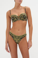 The Night Is Noir Underwire Bra explores a mesmorising sea of midnight hues finished with ornate golden swirls that dance alongside decadent botanical details and exquisite chain cascades. Crafted from ECONYL® regenerated nylon, this sustainable bikini top features hand-embellished CAMILLA crystals, underwire support, detachable straps and dainty cut-out details.