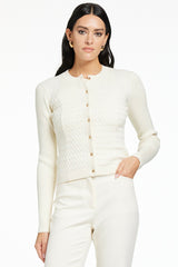 The Elise is a fitted crew-neck cardigan crafted from soft cable knit for a timeless feel. Classic yet modern, it offers a refined layer for any season. Style it buttoned up with a skirt or layered over a dress for effortless polish.