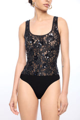 Make every night unforgettable in the Dina Sequin Lace Bodysuit. This sleek silhouette features a sheer black lace base embellished with shimmering sequins for the perfect balance of sultry and chic. Designed with a scoop neckline and fitted shape, it pairs effortlessly with leather pants, tailored trousers, or layered under a blazer for instant glamour.