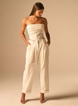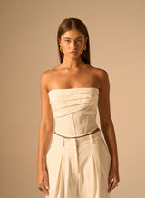 The Bellucci Top by JBQ features a strapless neckline, cropped length, subtle panel details, and a structured bodice with zipper closure. Made in USA of imported materials. Composition: 71.3% Polyester, 19.5% Rayon, 6.2% Spandex. Color: Ecru. Fit: Model is 5'9" wearing a small.