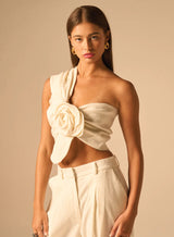The Camelia Top by JBQ is a one-shoulder cropped top designed for a unique modern silhouette. Made in USA of imported materials. Composition: 71.3% Polyester, 19.5% Rayon, 6.2% Spandex Color: Ecru Fit: Model is 5'9 wearing a small.