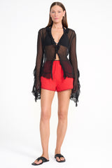 The Kellcy Top is a sheer crinkle chiffon long sleeve top featuring cascading ruffles at the front and sleeves.