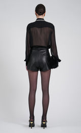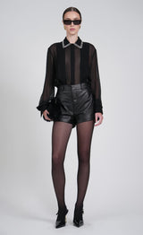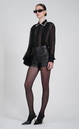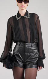 The Martini Top is a sheer, layered button-down crafted from 100% silk. Designed with pleated layers on both sides and a rhinestone-embellished collar for a touch of glamour, it features hidden button closures for a clean finish. A true statement piece that transcends seasons.