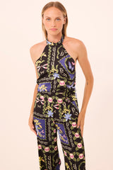 Ora is an asymmetric halter-style scarf top cut from our patchwork butterfly satin. This effortless silhouette features a double tie-back and an elasticized band for a secure fit, allowing it to be worn loose and open with ease. Pair it with the coordinating Izzie Pant for a chic set to carry you into spring .
