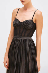 Sleek and striking, this midi dress is cut from sheer black tulle with shimmering lurex pinstripes throughout. The corset-style bodice features a sculpted bust and delicate straps, while the belted waist defines the silhouette before falling into a softly pleated A-line skirt. Finished with a concealed back zipper closure, it balances structure and fluidity with modern elegance.