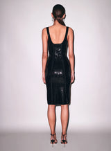 Our Sequin Knit Bodycon Midi Dress, featuring flattering square neckline with extra support at top cups and back for lift and smoothing, so no bra is needed. Corset effect princess seams give shape and flatter your figure. Pair with heels and your favorite Essentials panty for a look that goes perfectly from happy hour to after hours.