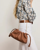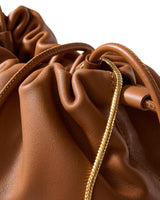 A petite take on our original Stash bag—that's still roomy enough to fit the largest iPhone. Crafted from smooth, supple tan leather, this pouch bag features a softly structured silhouette with a gathered, cinchable top, finished with tasseled drawstrings. Two straps—one in leather, the other a gold snake chain—offer maximum versatility. Inside, a zip pocket and magnetic tab closure keep your essentials secure.
