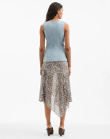 A casual take on a tailoring favorite. Our sleeveless Avalina vest is expertly crafted from thick stretch-cotton denim for flattering structure, featuring a deep V-cut and angled cutaway hem. Darting and angled seams highlight the waist, while tortoise buttons and paneled topstitching complete the look. Pair this light blue denim vest with the coordinating Hawthorne pant for a fresh take on the Canadian tuxedo.