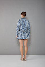 Cropped jacket with a classic collar and a frontal placket. It features a horizontal yoke at the front and back. It features long sleeves with back plackets and lined buttons in each cuff. The jacket is adorned with pearled flowers as decorative buttons. Made from intricately embroidered denim fabric.