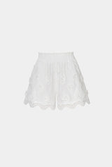 High-waisted shorts with a shirred elastic waistband for enhanced shaping and easy pull-over. They feature an A-line silhouette for a relaxed look and have practical slashed side pockets.. They are adorned with a lace trim at the hem. Made of embroidered cotton eyelet fabric.