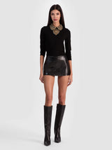 Short, flirty, and secretly practical. The Mace faux leather mini skort gives you the best of both worlds with a skirt silhouette and built-in shorts that keep things comfortable and covered. The perfect rise sits on the waist just right, while the classic black vegan leather makes it closet-staple worthy. Style it with a crisp button-down for contrast or keep it playful with a fitted knit.