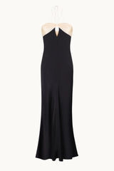 This draped taffeta bustier dress has a contrast bodice supported by straps, a flawless bias-cut slip silhouette, a keyhole cutout, and a floor-reaching hemline for a wow effect.