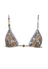 The ROBIN Bikini Set is a stylish and flattering design, featuring a triangle top with thin, adjustable straps for a customizable fit. One strap is adorned with delicate bead detailing, adding a unique touch, while a gold ring accent at the center brings a hint of elegance. The matching bottoms have adjustable side ties and a minimal coverage cut, perfect for achieving a sleek and confident beach look.