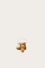 A heeled sandal with clear straps and gold-toned footbed with beaded heel detail.