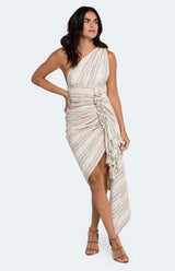 The Cabo Dress is crafted in luxury certified organic cotton. The one-shoulder silhouette is taking inspiration from our resort-ready sarongs gathered with knotted hips that flow into a tassel-trimmed high-low hem.