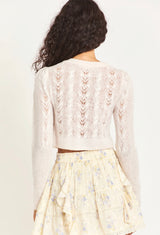 Introducing our Birch Cardigan. This warm weather layer arrives in a lightweight, airy cashmere wool blended sheer fabric with a pretty pointelle detailing. The summertime knit has long puff sleeves, dreamy novelty buttons at center front, and tulle tape at the inside of the placket for added detail.