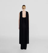 The Batista long dress boasts a softly draped cowl scoop neckline and a deep, round open back, followed by flowing shoulder sashes that cascade into a sleek, column-shaped silhouette.