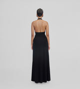 Our Villadiego dress perfectly blends our two most iconic fabrics. This long halter dress features a deep V neckline with a softly draped bust and strategically ruched straps that elegantly sculpt the body. A cascade of handmade flowers that gracefully embellish the design, showcasing our new floral creation. The draped open back and sleek A-line skirt complete this ensemble.