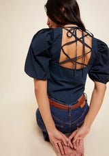 The easiest way to add some feminine edge to your look. Short, contrast poplin balloon sleeves with elastic cuffs, a square neckline, and a surprise lace up back detail to wow as you walk away.